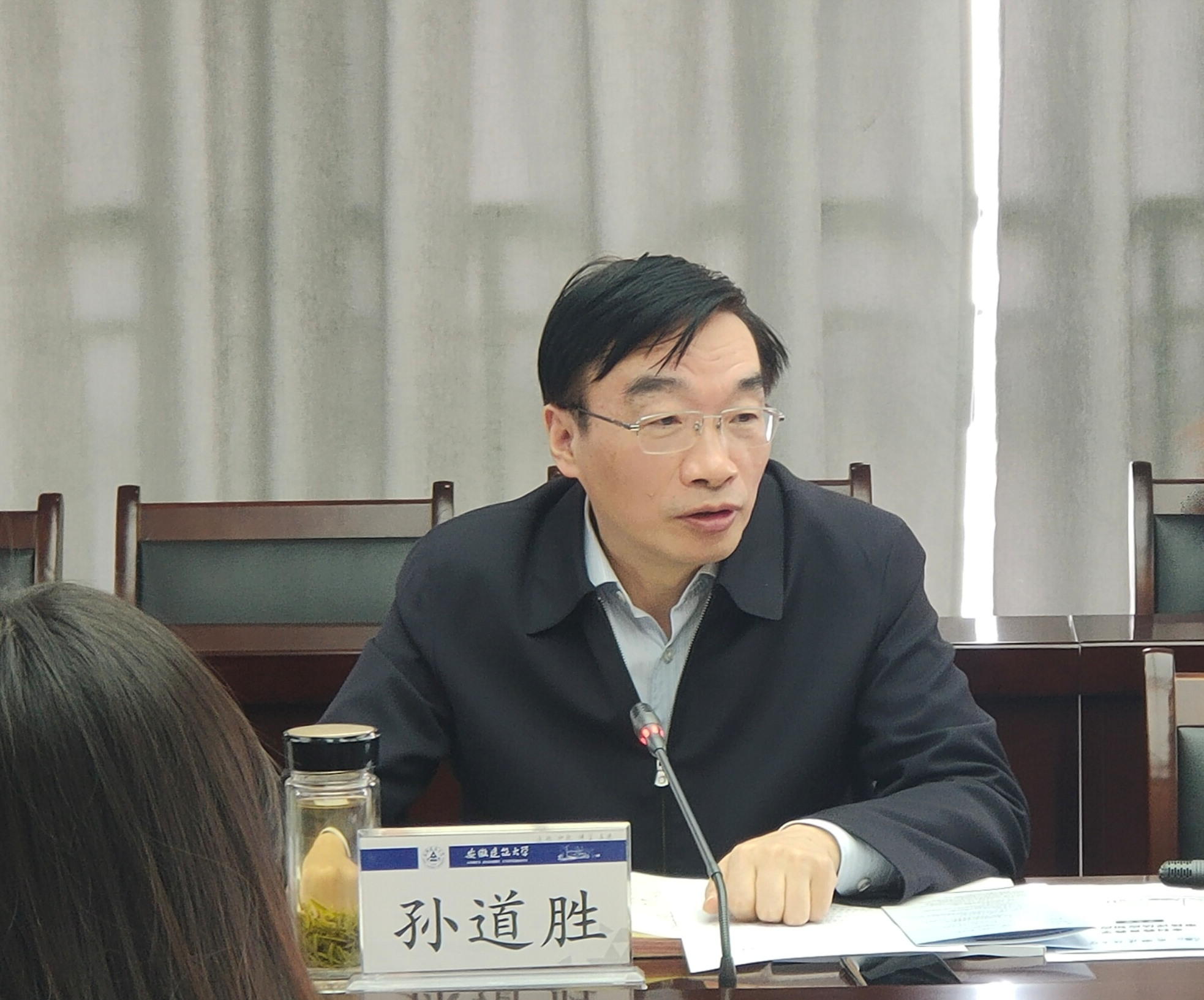 孙道胜在听取汇报后做总结讲话,他首先对各教学单位在自评自建阶段取得的初步成效表示了肯定,同时,也指出了存在的问题与不足。孙道胜强调,新一轮审核评估充分利用信息化手段,深度挖掘常态检测数据,采取线上与入校结合、定性与定量结合、明察与暗访结合等方式,对学校本科教育教学和人才培养质量进行全面总结、全面审视、全面诊断,做好本轮审核评估工作,意义重大,影响深远。孙道胜对扎实推进审核评估工作提出三点要求:一是要先学一步当内行,积极了解审核评估相关政策文件的核心要义,对照指标体系,办好社会主义大学。二是要系统推进全行动,进一步强化主人翁意识和担当精神,按照工作推进任务清单,从每项工作、每个环节抓起,尽职履责,将工作做细做实。三是要以评促建上水平,针对迎评过程中产生的问题与不足,分析原因,落实整改,围绕“学生中心、产出导向、持续改进”理念,不断提升教师教学水平,提高教学组织管理水平。